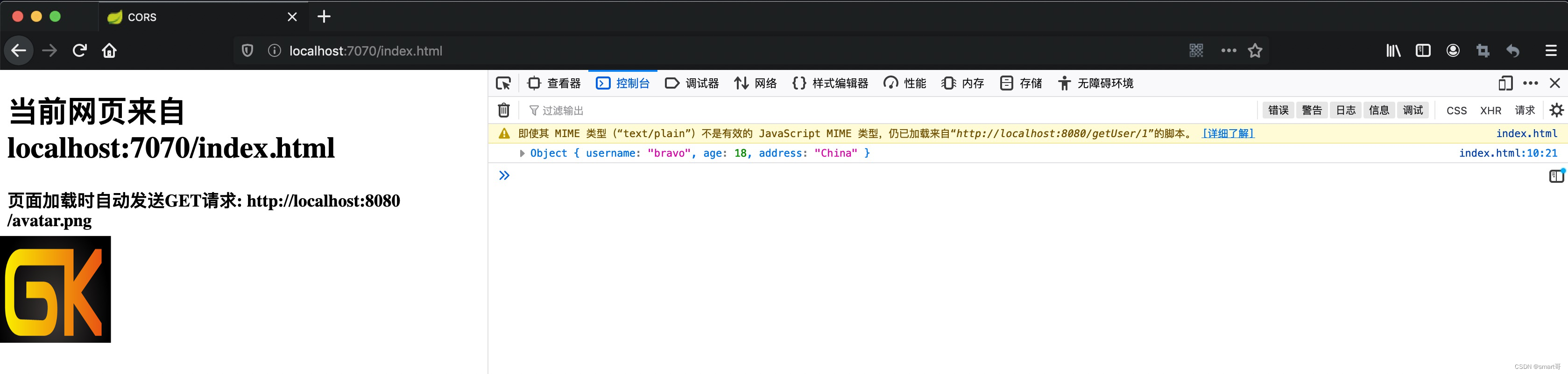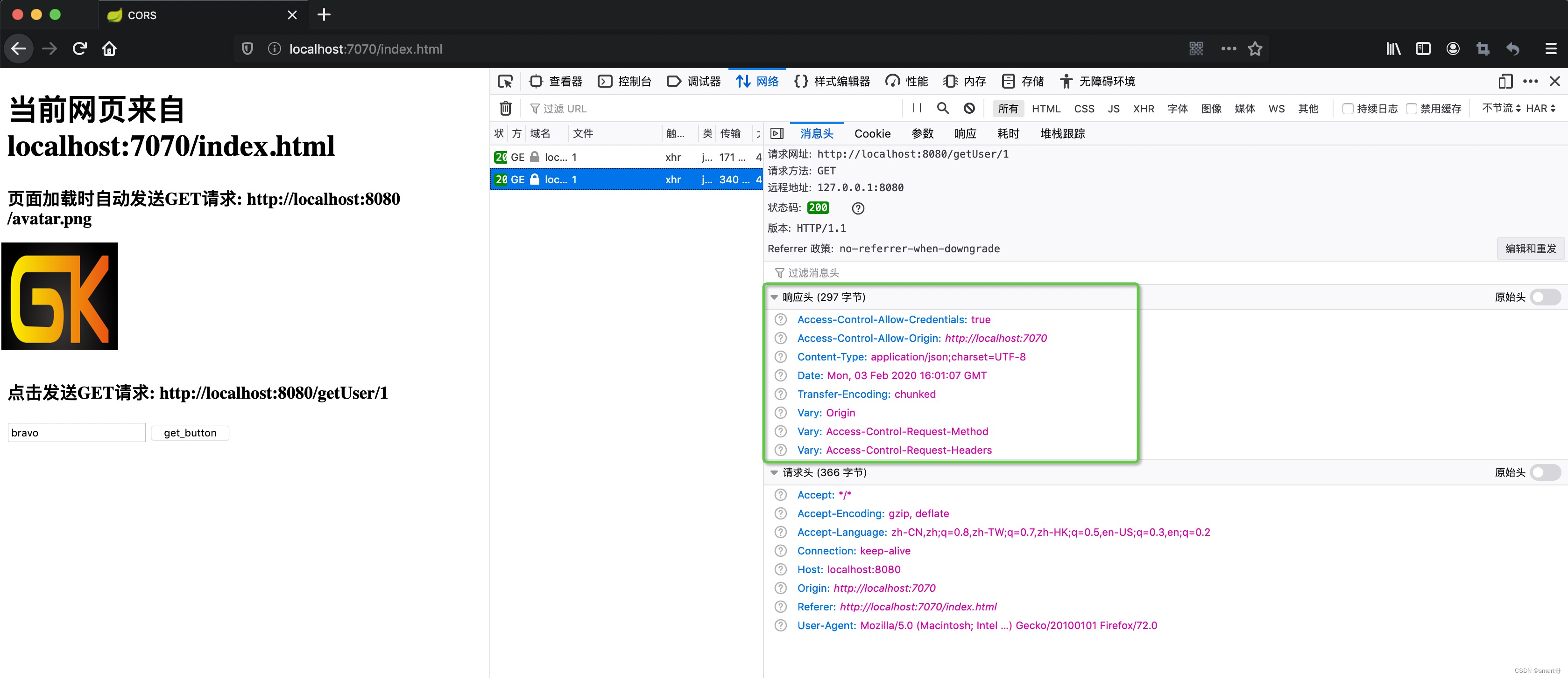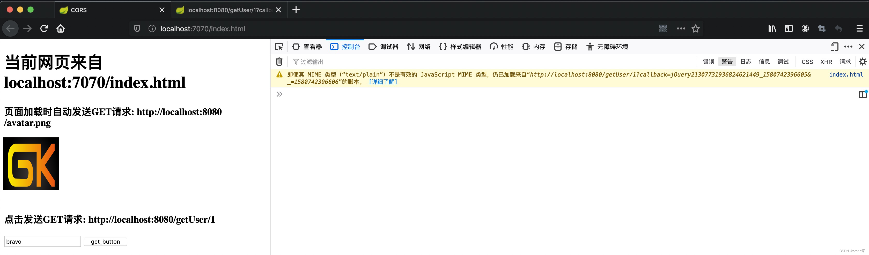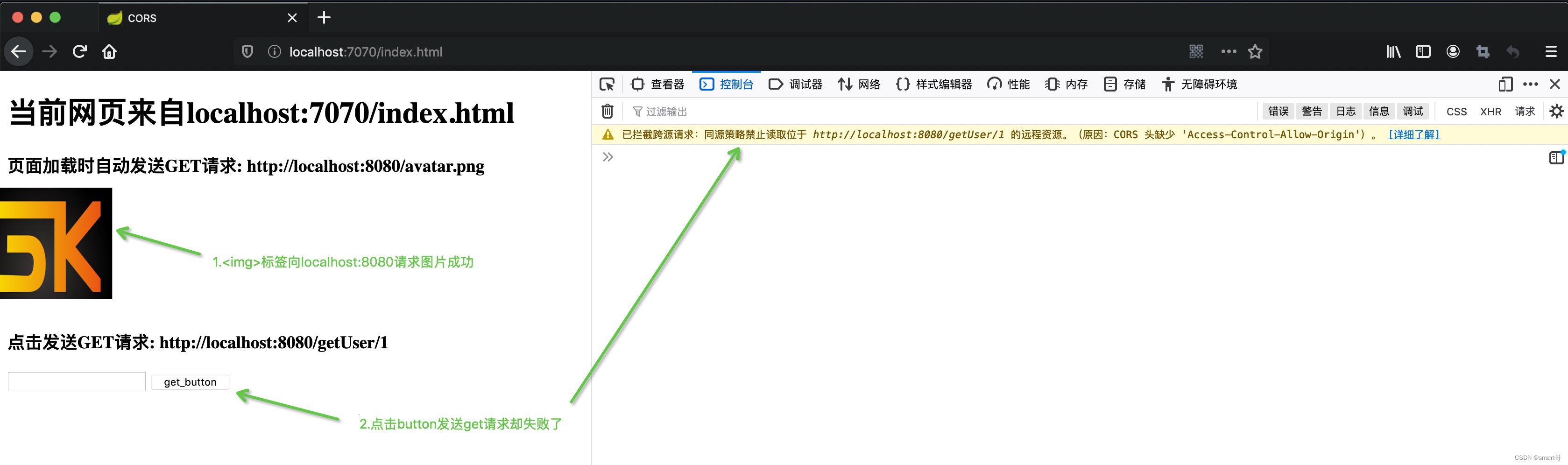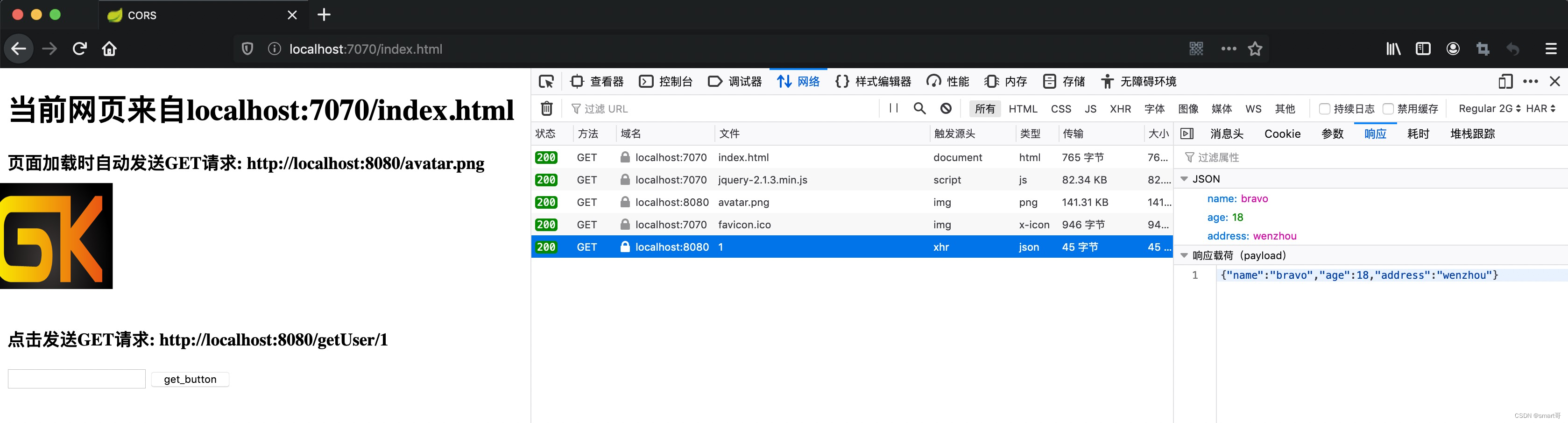 本案例中,页面index.html来自localhost:7070,而<img>和AJAX的GET都指向localhost:8080,都跨域了: