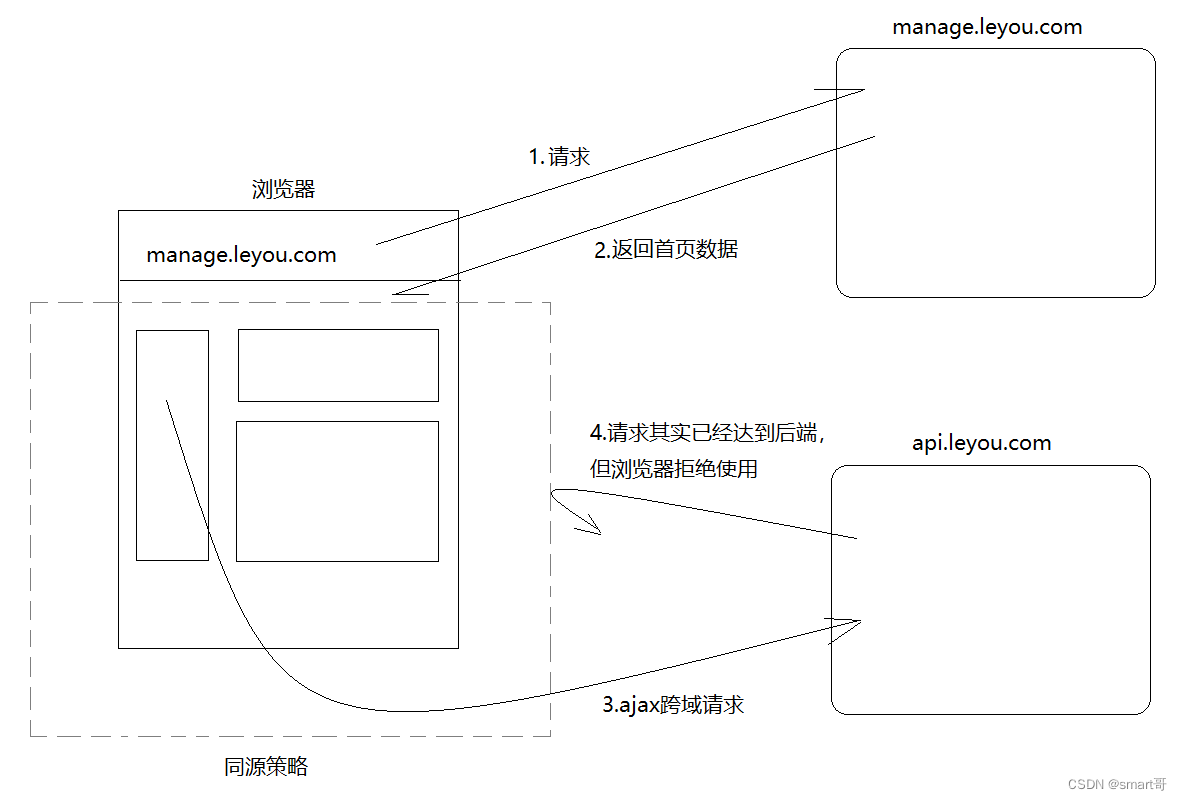 而上面示意图中,在manage.leyou.com的页面访问api.leyou.com的接口,由于二级域名不同,导致跨域。从这个角度来看,只要是前后端分离的项目,必然跨域!(即使部署在同一个服务器,前后端项目端口肯定不同)