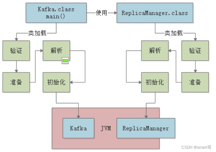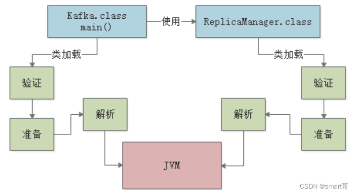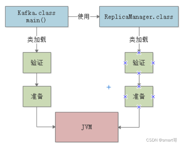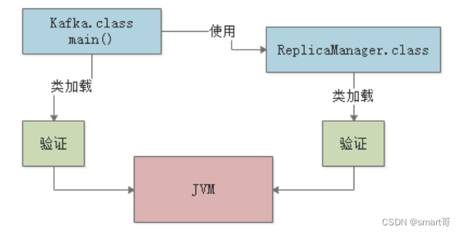代码示例中,Kafka类用到了ReplicaManager类,所以它们都会在被加载进JVM后进行验证: