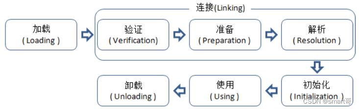 加载(Loading)、验证(Verification)、准备(Preparation)、解析(Resolution)、初始化(Initialization)、使用(Using)、卸载(Unloading),共7个阶段。