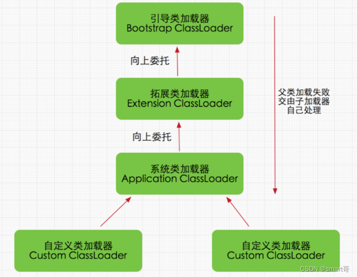 - 如果Bootstrap ClassLoader加载失败(例如在$JAVA_HOME/jre/lib里未查找到该class),会使用Extension ClassLoader来尝试加载;