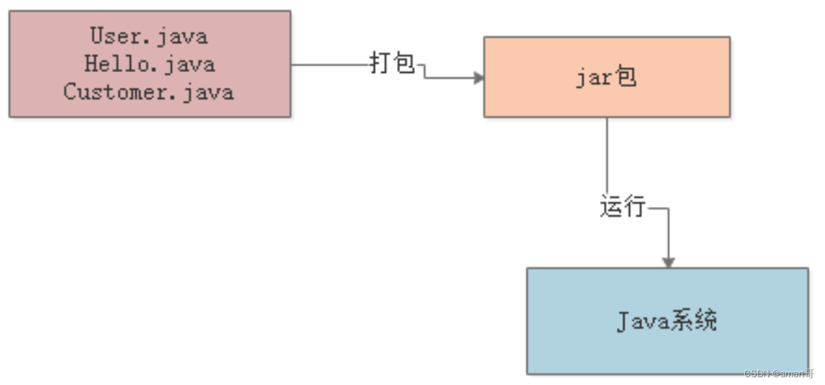 - IDE自动帮我们编译成.class文件(也可以手动通过javac命令编译),然后打包成jar包或者war包;