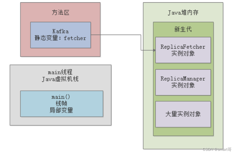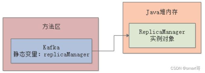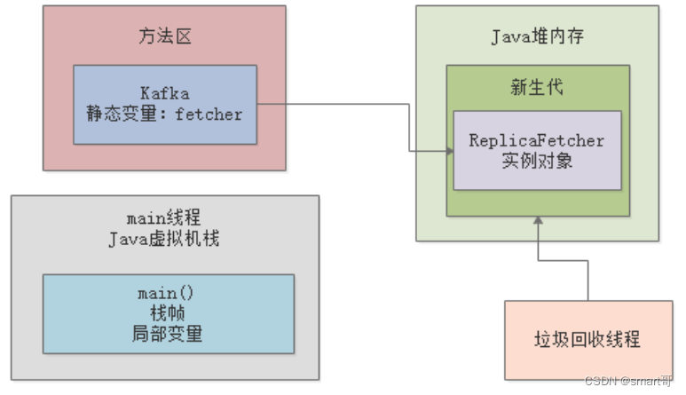 假如此时新生代的内存已经快满了,发生了“Minor GC”,那么JVM会分析ReplicaManager对象的可达性,发现它被“replicaManager”这个方法区中的静态变量引用着,在JVM规范中, 静态变量是可以作为GC Roots的 ,所以就不会被回收。