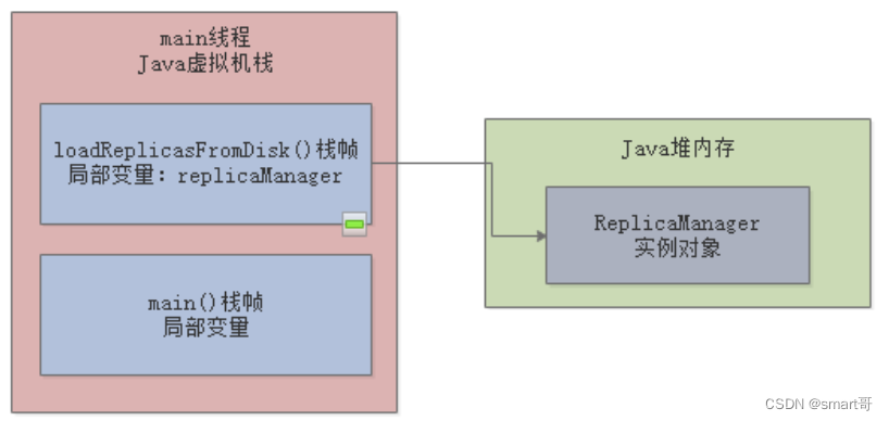 假如此时新生代的内存已经快满了,发生了“Minor GC”,那么JVM会分析ReplicaManager对象的可达性,发现它被“replicaManager”这个局部变量引用着,在JVM规范中, 局部变量是可以作为GC Roots的 ,所以就不会被回收。