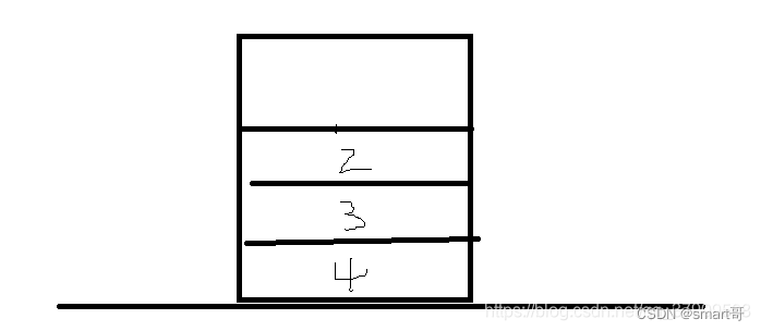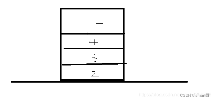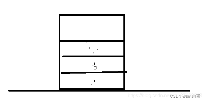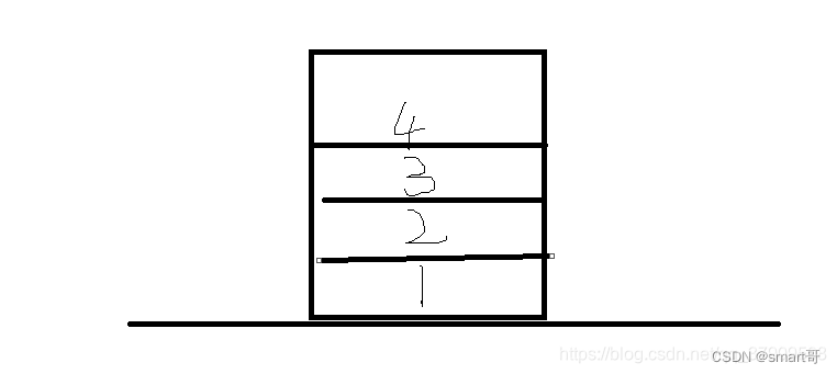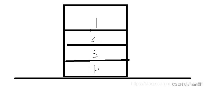 假设两个栈刚开始都没有数据,刚开始执行 public void push(1),这样的话stack1就有了第一条数据(第一次没有执行while,因为stack2为空),第二继续public void push(2),stack2没有数据继续压栈到stack1中,继续 public void push(3), public void push(4)进行压栈,现在stack1有数据,stack2没有数据,stack1的栈中数据如下图所示: