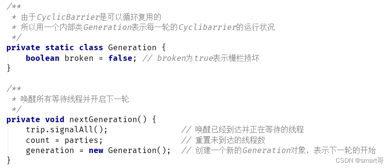 我们知道, CyclicBarrier 是可以循环复用的,所以 CyclicBarrier 的每一轮任务都需要对应一个generation 对象。generation 对象内部有个 broken 字段,用来标识当前轮次的 CyclicBarrier 是否已经损坏。
