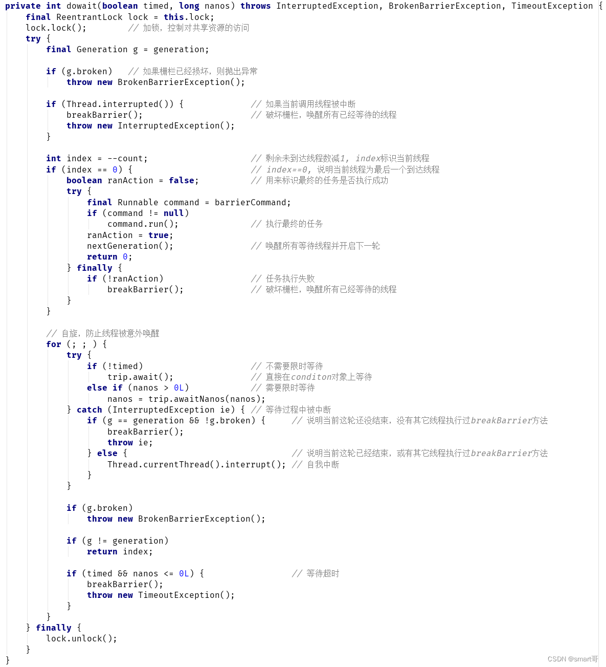 - 对于不是最后一个到达的线程,会在 Condition 队列上等待,为了防止被意外唤醒,这里用了一个自旋操作。