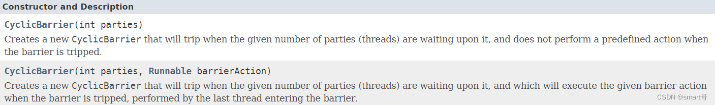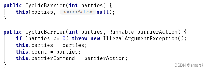 从CyclicBarrier的构造器,我们也可以看出关于这个类的一些端倪,CyclicBarrier有两个构造器: