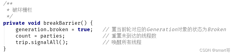 - 判断栅栏是否已经损坏或当前线程已经被中断,如果是会分别抛出异常;
