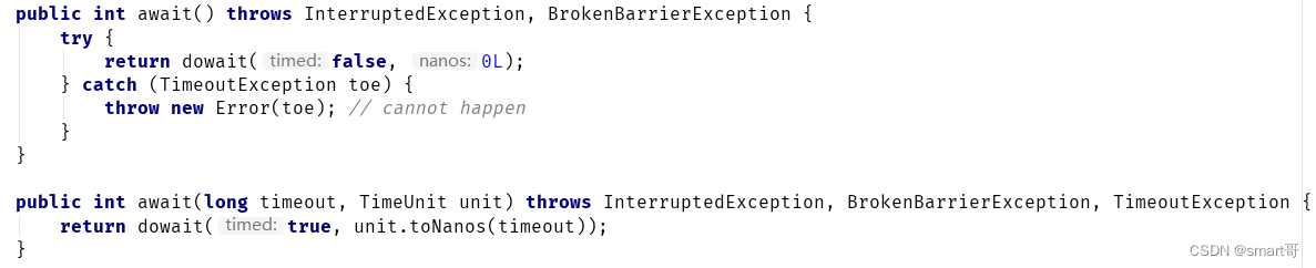 可以看到,这个方法除了抛出 InterruptedException 异常外,还会抛出BrokenBarrierException。