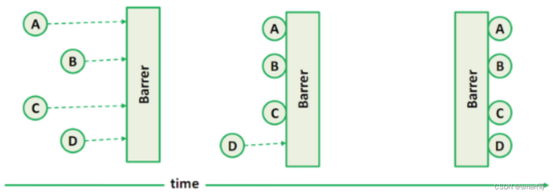 一共4个线程A、B、C、D,它们到达栅栏的顺序可能各不相同。当A、B、C到达栅栏后,由于没有满足总数【4】的要求,所以会一直等待,当线程D到达后,栅栏才会放行。