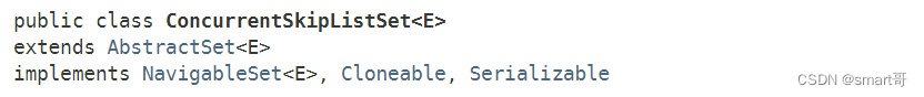 可以看到,ConcurrentSkipListSet实现了NavigableSet接口,在Java多线程进阶(24)—— J.U.C之collections框架:ConcurrentSkipListMap中,我们提到过ConcurrentSkipListMap实现了NavigableMap接口,以提供和排序相关的功能,维持元素的有序性,所以 ConcurrentSkipListSet 就是一种为并发环境设计的有序SET工具类。