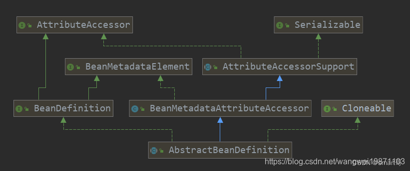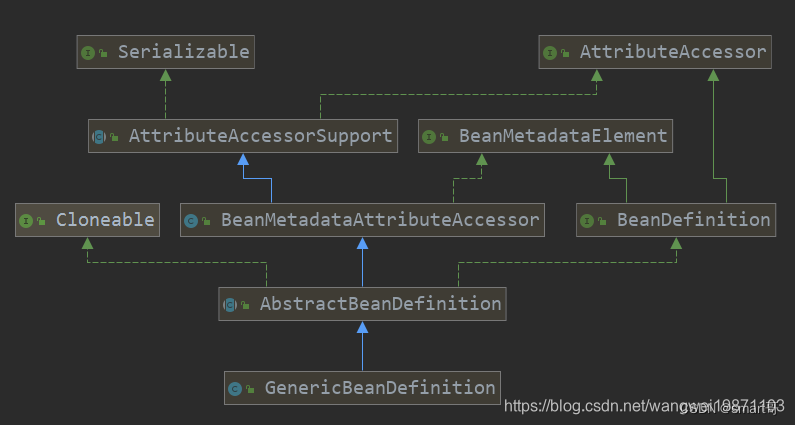 其实就是继承了上面的bean元数据访问器并且实现了bean定义接口,这样的话就可以让bean的元数据和bean的定义接口联系起来了,也就是数据和操作结合了。这个类比较长,我不打算从头到位贴上来,说几个要注意的地方:
