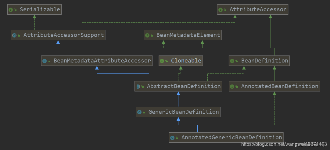 别看他的继承如图那么复杂,其实就是上面讲的这些,就是将通用bean定义GenericBeanDefinition和注解bean定义AnnotatedBeanDefinition拼起来了。