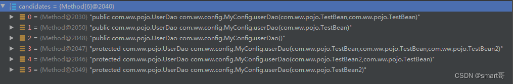 因为接下去解析的工厂方法是有参数的,所以要进行一些处理,比如获取构造器参数值(如果有传的话),然后获取自动装配模式,工厂方法一般默认是AUTOWIRE_CONSTRUCTOR,还会定义一个minTypeDiffWeight 差异值,这个就是用在如果有多个工厂方法的时候,看工厂方法的参数和具体装配的bean的类型的差异,取最小的。还定义了有个ambiguousFactoryMethods ,用来存放差异值一样的方法,说明是一样的类型,无法判断要用哪个工厂方法实例化。比如protected UserDao userDao(TestBean2 t2)和public UserDao userDao(TestBean t1)两个构造方法类型差异是一样的,所以不知道要用哪个,就会报异常啦。还有minNrOfArgs也很关键,用来做优化的,如果有最小参数个数,那么一些参数个数少于最小个数的就不需要去判断了,直接跳过,否则就算获取到了也不匹配,反而浪费资源了。如果minNrOfArgs为0,那就说明没有参数个数限制,那后面就需要一个个去判断哪个差异最小,最符合了。