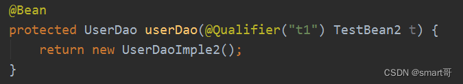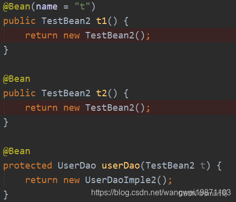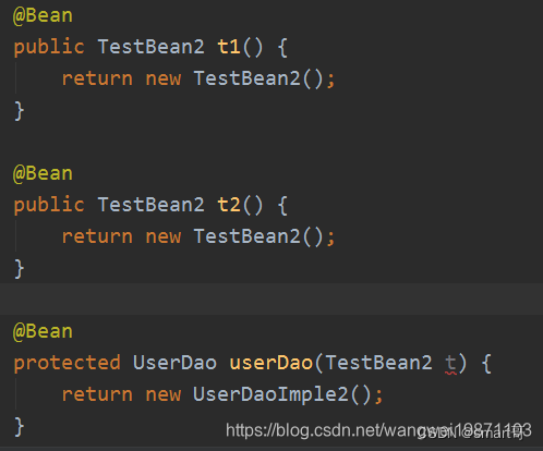 org.springframework.beans.factory.UnsatisfiedDependencyException: Error creating bean with name 'userDao' defined in com.ww.config.MyConfig: Unsatisfied dependency expressed through method 'userDao' parameter 0; nested exception is org.springframework.beans.factory.NoUniqueBeanDefinitionException: No qualifying bean of type 'com.ww.pojo.TestBean2' available: expected single matching bean but found 2: t1,t2