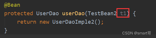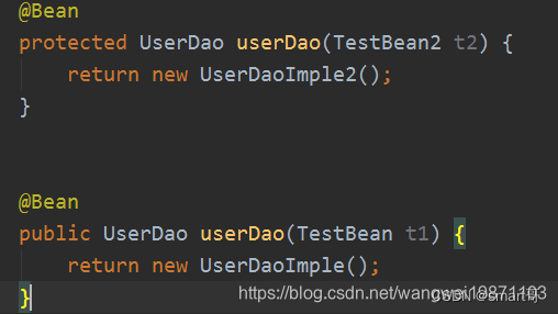 org.springframework.beans.factory.BeanCreationException: Error creating bean with name 'userDao' defined in com.ww.config.MyConfig: Ambiguous factory method matches found in bean 'userDao' (hint: specify index/type/name arguments for simple parameters to avoid type ambiguities): [public com.ww.pojo.UserDao com.ww.config.MyConfig.userDao(com.ww.pojo.TestBean), protected com.ww.pojo.UserDao com.ww.config.MyConfig.userDao(com.ww.pojo.TestBean2)]