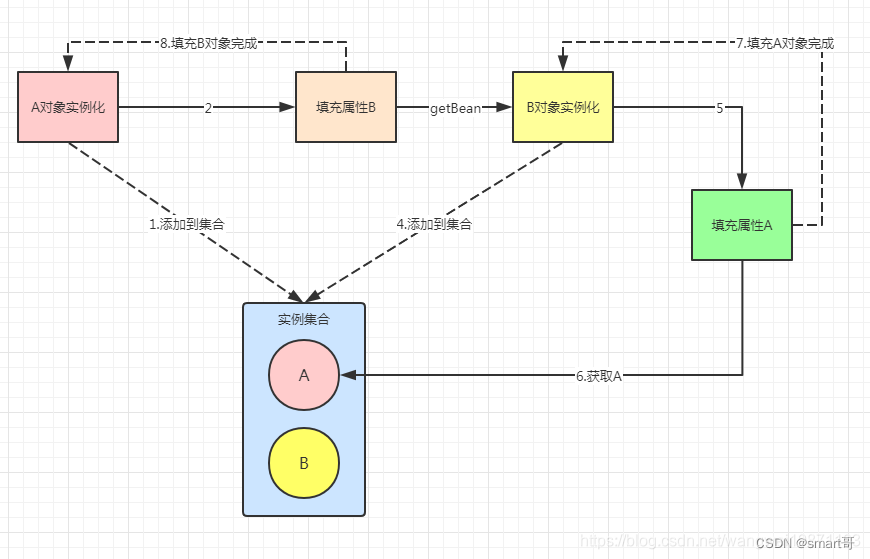 简单的说就是先实例化的对象A保存到一个集合里,然后填充属性,实例化他依赖的对象B,如果依赖的对象B又依赖A,此时去一个实例集合里查找是否有A,发现有A了就取出来,就给B充填属性,然后B就完整了,然后B也填充了,A也完整了。其实原理很简单,就是找个地方放一下,避免有其他的依赖,有依赖就取出来给他们。