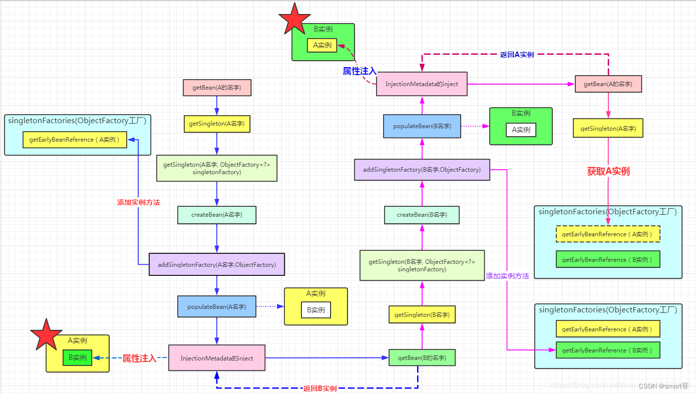 先看下循环依赖是怎么解决的流程图,精简版: