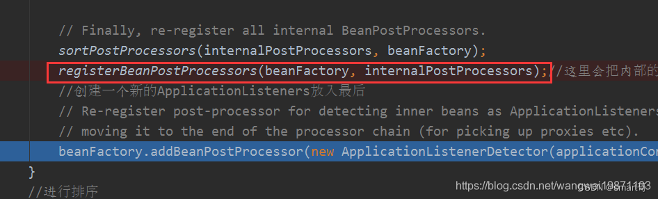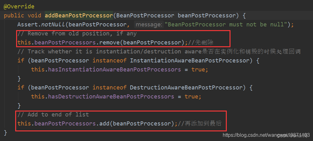 但是有个问题,有没想过,为什么我们的处理器是在内部处理器AutowiredAnnotationBeanPostProcessor之前处理的,我们没有声明任何优先排序啊,其实这个是在注册处理器registerBeanPostProcessors的中将MergedBeanDefinitionPostProcessor类型的放入internalPostProcessors中了,而AutowiredAnnotationBeanPostProcessor和CommonAnnotationBeanPostProcessor刚好是这个类型的,他们最后又被注册了一遍,而注册的方法是会把存在的删除,然后把新注册的放最后。