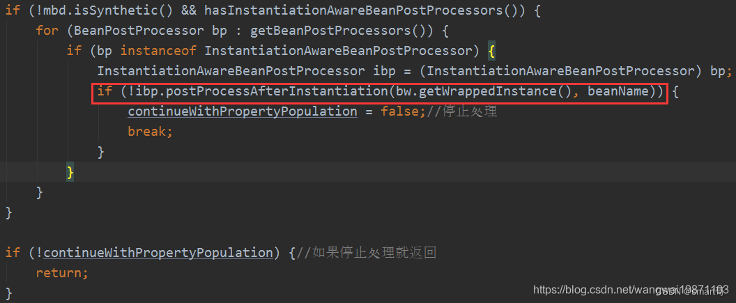 在实例化之后,populateBean开始的时候,做一些处理,如果说是返回false的话,就会停止populateBean,直接返回了,也就是说你可以控制是否需要继续注入处理。