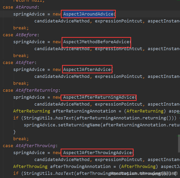 首先当然去获取切点啦,先找下方法注解里面有没有AspectJ相关的注解Pointcut.class, Around.class, Before.class, After.class, AfterReturning.class, AfterThrowing.class,没有当然就不用处理啦。有的话就要创建切点表达式,然后返回。