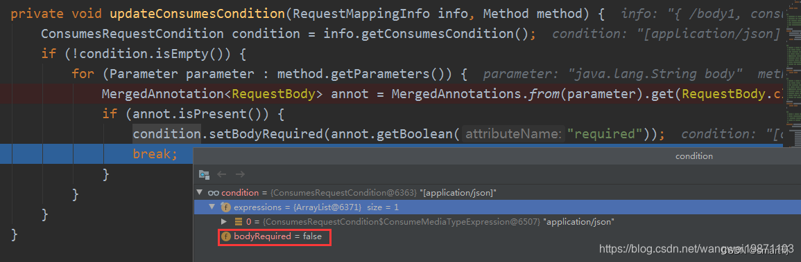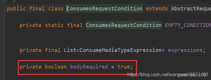 这个用于更新接受数据的条件,如果设置了consumes,比如下面的传入数据条件是json格式,但是@RequestBody的required =false,这样他就会设置consumes 的required也为false,默认是true的,也就是不强制了: