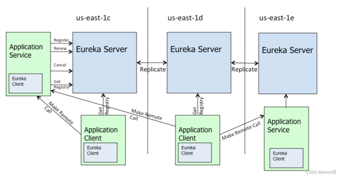 Eureka本身为了实现高可用,支持 集群部署 。 我们假设有三台 Eureka Server 组成的集群,第一台 Eureka Server 在us-east-1c机房,另外两台 Eureka Server 分别部署在us-east-1d和us-east-1e机房。