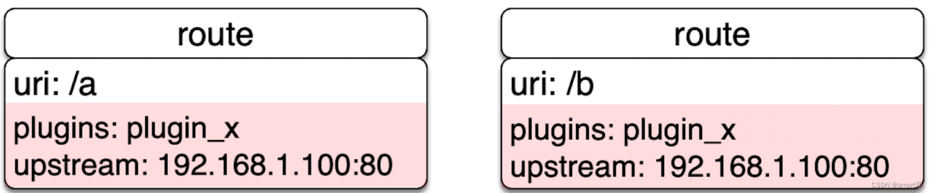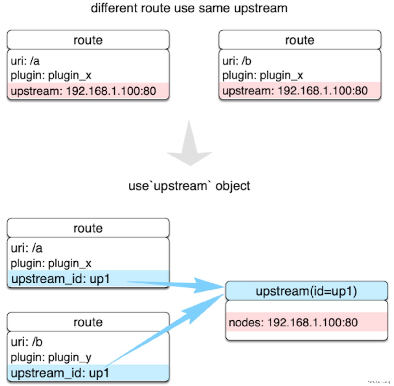 如果两个 Route 中的上游是一样的,但是绑定的插件各自不同,那么我们就可以把上游单独抽象出来,如下图所示: