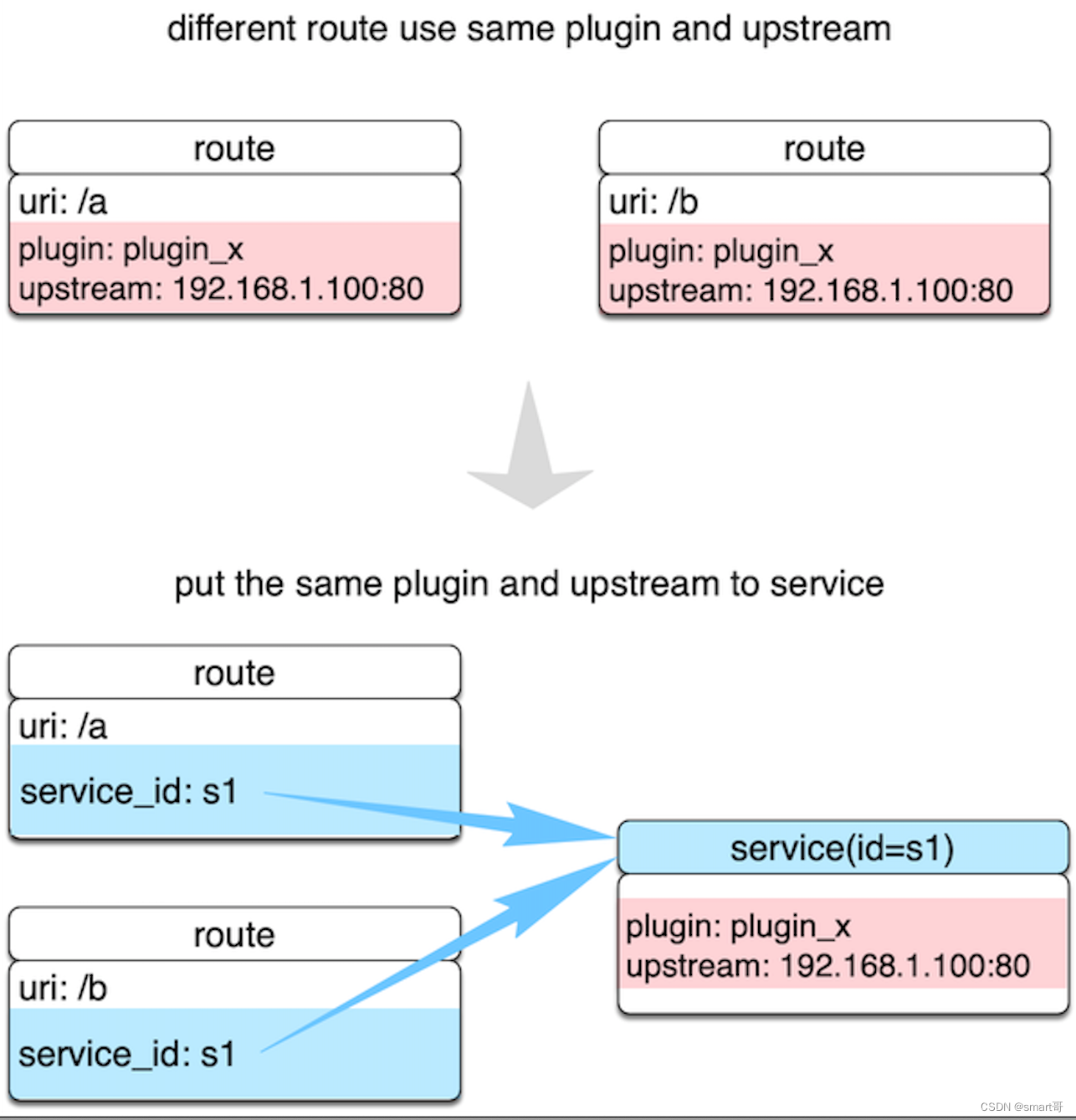 在 API 和上游很多的情况下,会有很多重复的配置。这时候,我们一般需要 Service 和 Upstream 这两个概念来做一层抽象。