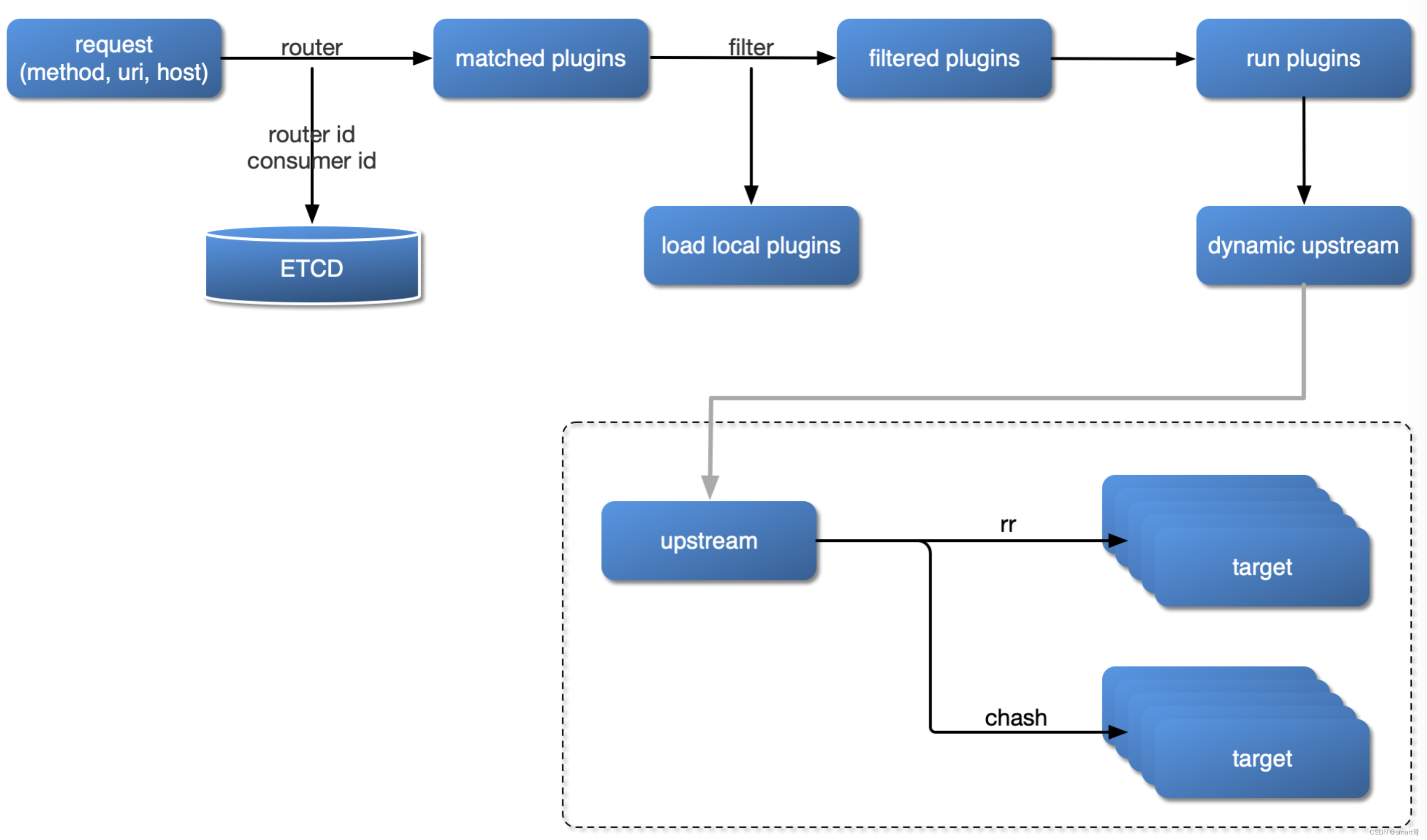 - 当一个用户请求进入 API 网关时,首先,会根据请求的方法、uri、host、请求头等条件,去路由规则中进行匹配,如果命中了某条路由规则,就会从 etcd 中获取对应的插件列表;