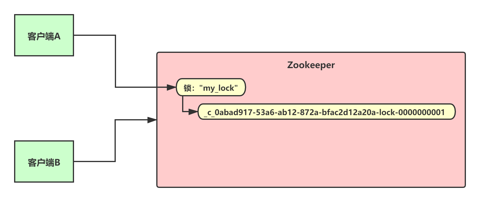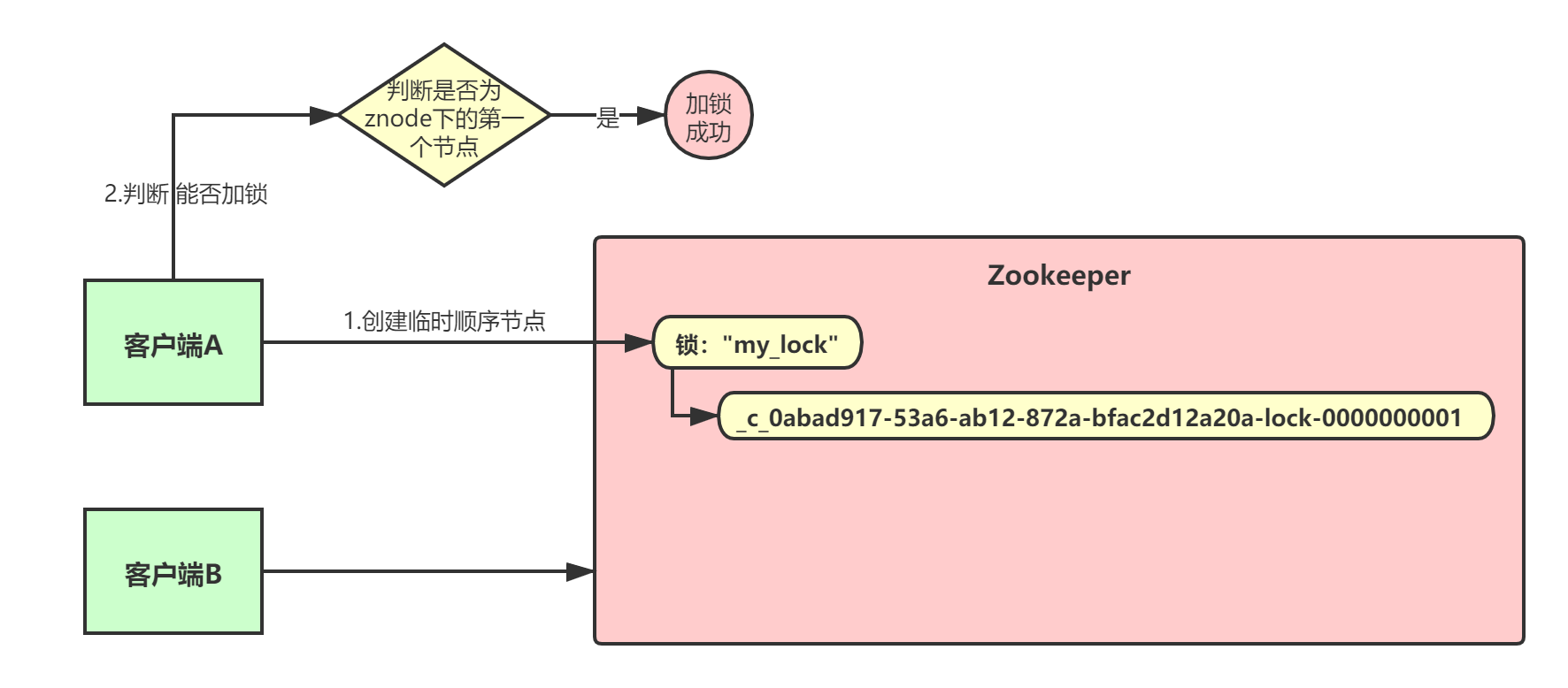 解决该问题的一个基本思路就是,Zookeeper在创建“锁”时保存对应客户端的标识,这样客户端A如果挂了,客户端B尝试来获取锁时,Zookeeper就会判断客户端A的锁还没释放,就会拒绝客户端B获取锁。