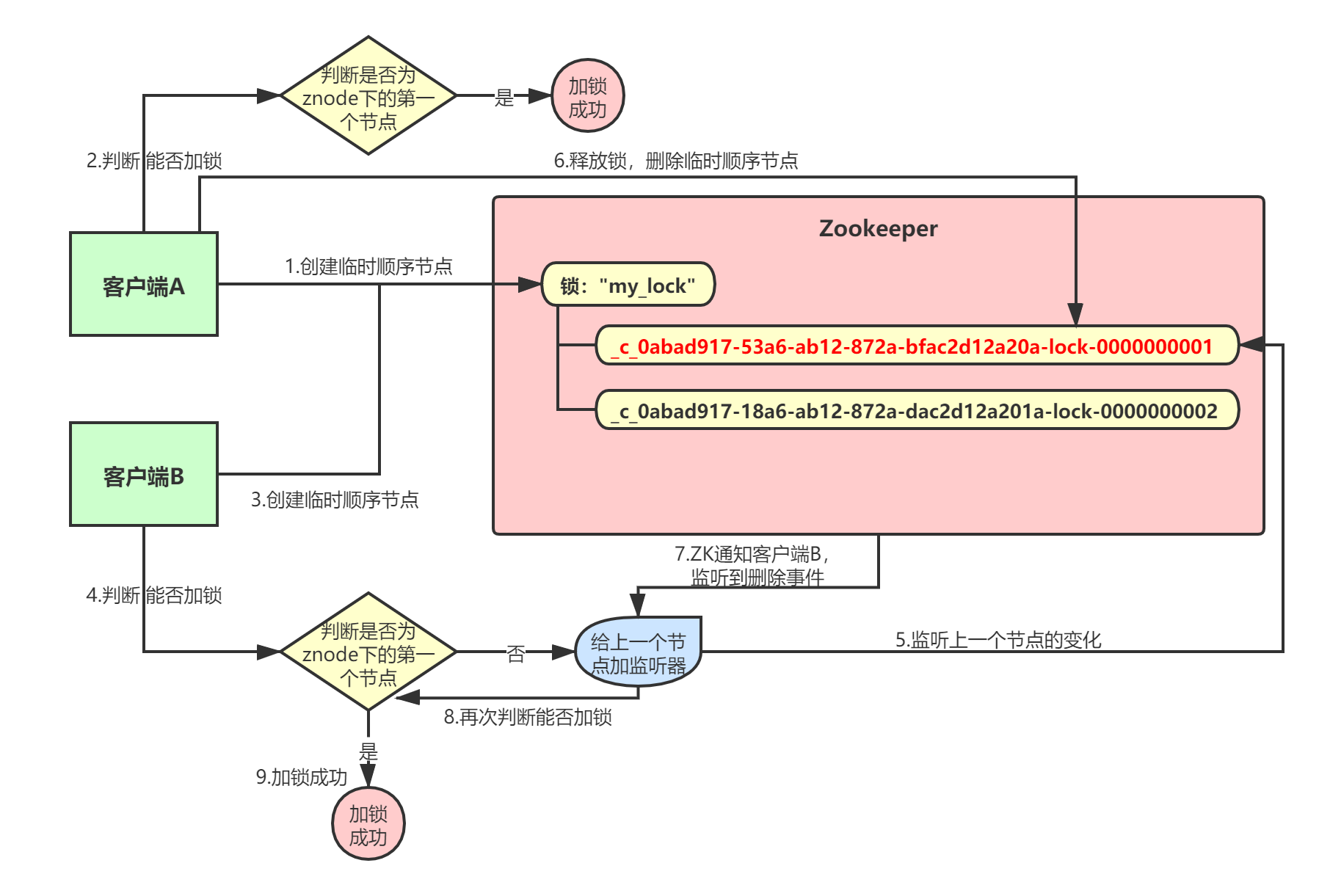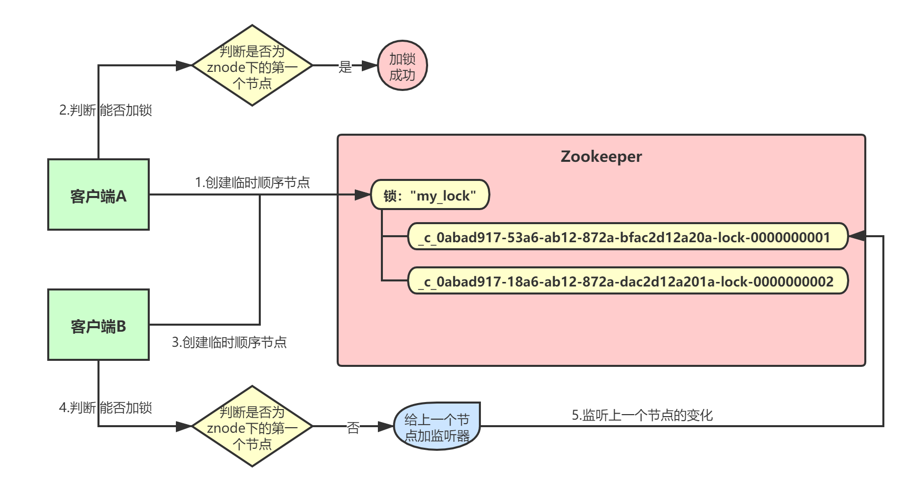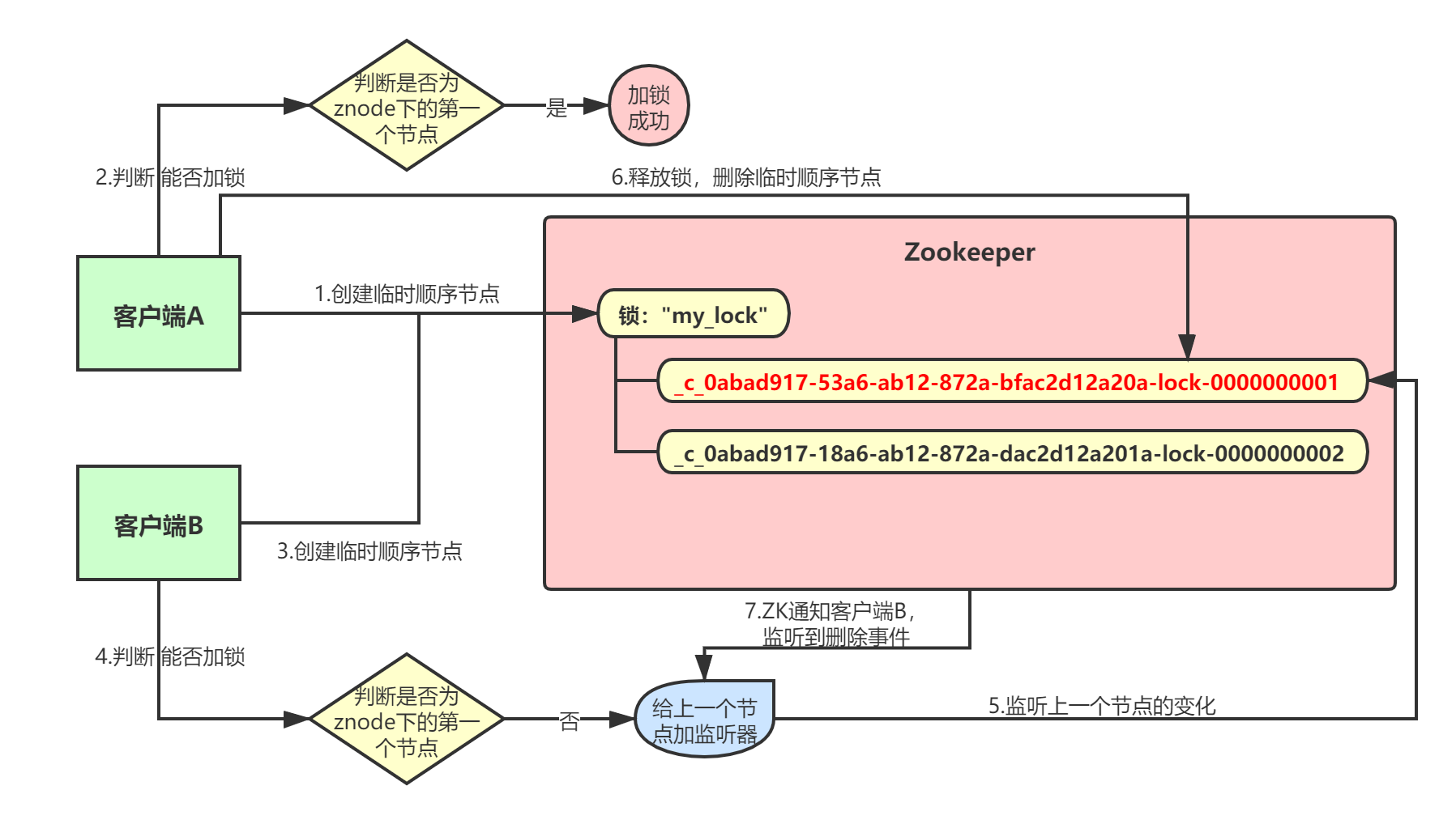 客户端B还想自己创建的顺序节点不是第一个,所以加锁失败!加锁失败以后,客户端B就会通过ZK的API, 对他的上一个顺序节点加一个监听器 ,监听这个节点是否被删除等变化。