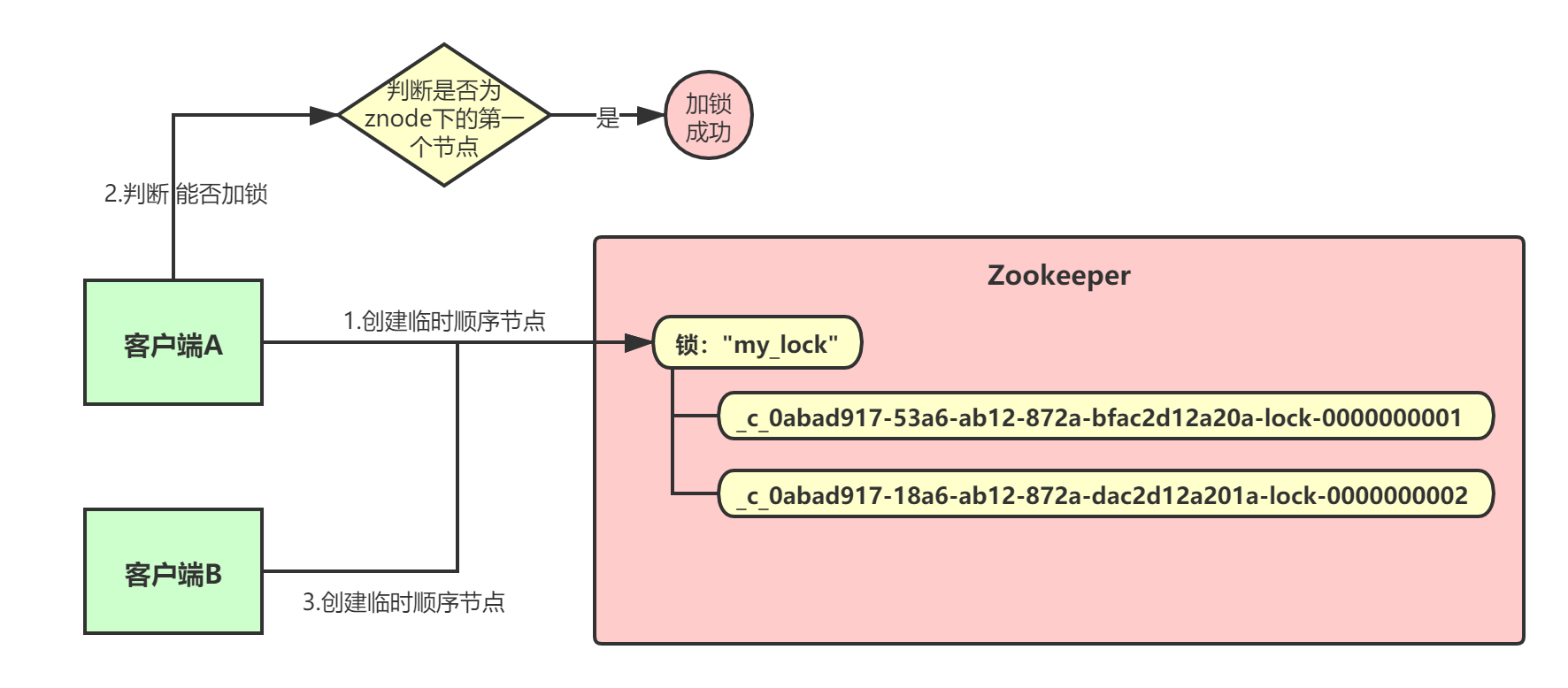 然后,客户端A判断自己创建的那个顺序节点是不是排在第一个的,如果是就加锁成功了: