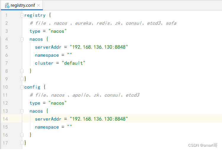 服务端主要是修改\seata\conf\registry.conf文件,让Seata使用Nacos作为注册配置中心,修改后的文件如下: