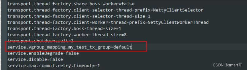 如上图所示,修改的格式为service.vgroup_mapping.${spring.alibaba.seata.tx-service-group}=default,结合我们的系统服务修改后的结果如下: