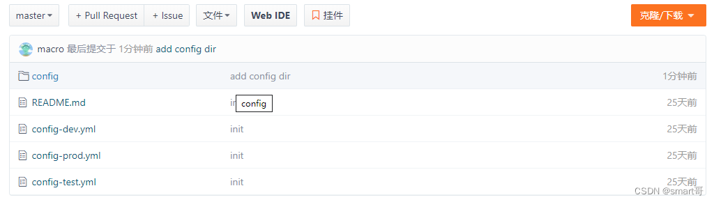 由于Spring Cloud Config 需要一个存储配置信息的Git仓库,这里我们先在Git仓库中添加好配置文件再演示其功能,Git仓库地址为:https://gitee.com/macrozheng/springcloud-config。