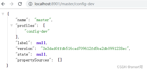 - 访问http://localhost:8901/master/config-dev来获取master分支上dev环境的配置信息;