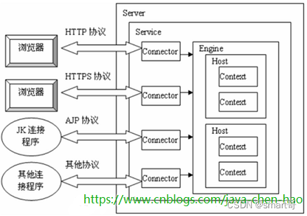 一个Tomcat中只有一个Server,一个Server可以包含多个Service,一个Service只有一个Container,但是可以有多个Connectors,这是因为一个服务可以有多个连接,如同时提供Http和Https链接,也可以提供向相同协议不同端口的连接,示意图如下(Engine、Host、Context下边会说到):