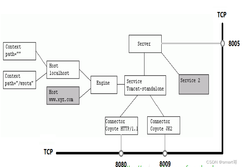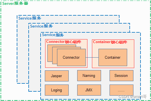 从上图我们看出,最核心的两个组件--连接器(Connector)和容器(Container)起到心脏的作用,他们至关重要!他们的作用如下: