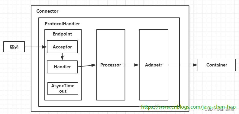 (1)Endpoint用来处理底层Socket的网络连接,Processor用于将Endpoint接收到的Socket封装成Request,Adapter用于将Request交给Container进行具体的处理。