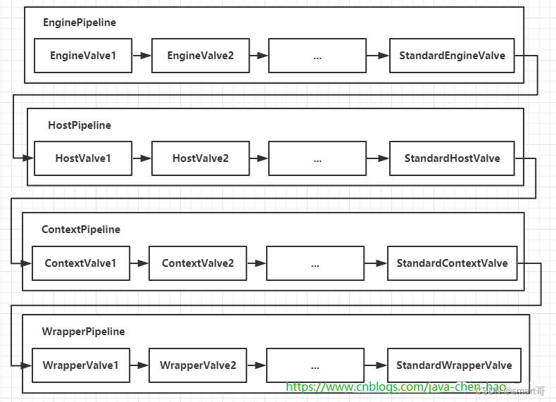 我们知道Container包含四个子容器,而这四个子容器对应的BaseValve分别在:StandardEngineValve、StandardHostValve、StandardContextValve、StandardWrapperValve。