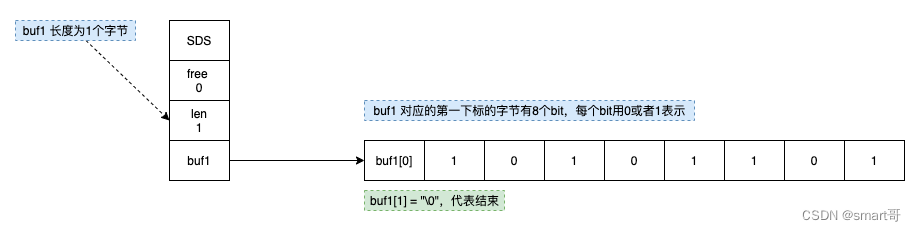 BitMap (位图)的底层数据结构使用的是String类型的的 SDS 数据结构来保存。因为一个字节8个bit位,为了有效的将字节的8个bit都利用到位,使用数组模式存储。