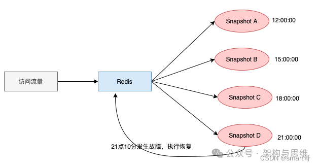如上图,将指定时间的Redis缓存数据进行快照。当发生故障的时候,直接从最接近的时间点进行数据恢复(即21:10的故障按照21点的RDB快照进行恢复),直接将 RDB 文件读入内存完成恢复。