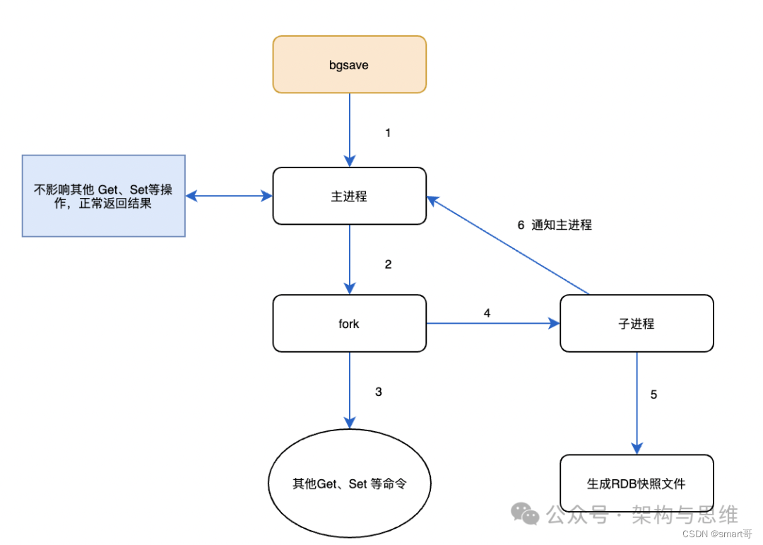 bgsave是后台异步执行,通过调用glibc函数创建一个子进程专门用于写入RDB文件,从而避免了主线程的阻塞。当执行BGSAVE命令时,Redis会继续处理其他客户端请求(比如Get、Set等),而子进程会在后台完成RDB文件的生成。这是Redis RDB文件生成的默认配置,也是推荐的方式。