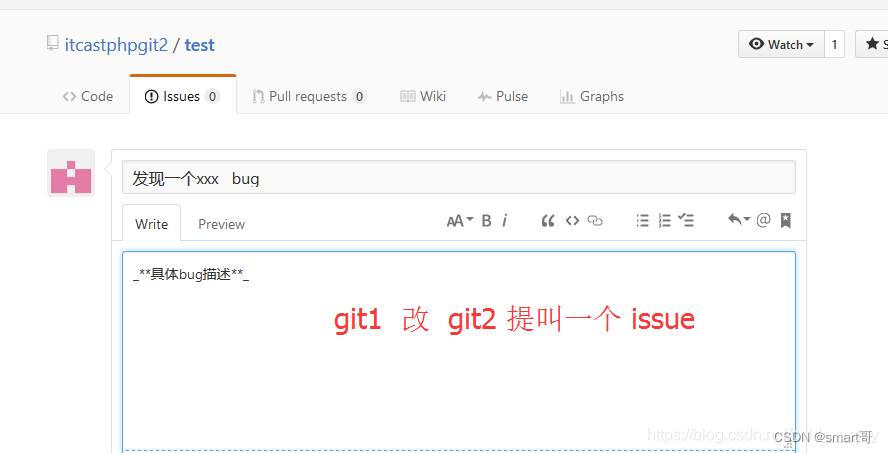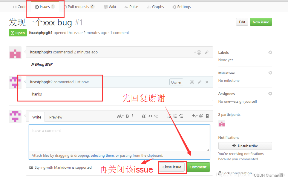 情景: 张三发现李四开源git库,提交了一个issue;李四隔天登录在github主页看到通知并和张三交流,最后关闭issue