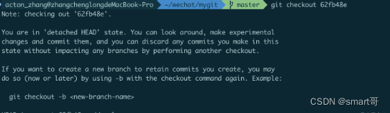 从这段信息中可以看出,当前正处于detached HEAD状态。可以从现在这个Commit开出新的分支。使用Checkout命令的-b参数直接创建分支并自动切换过去: