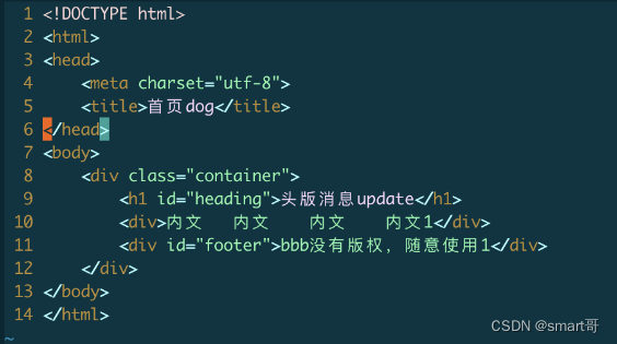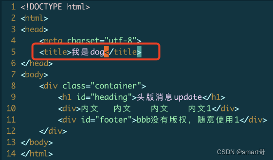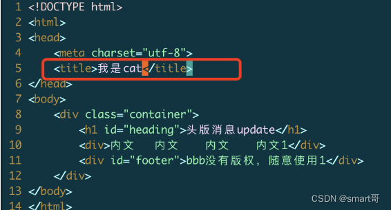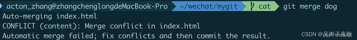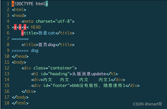 Git可以检查出简单的冲突,所以并不是改到同一个文件就一定会发生冲突,但改到同一行就会出现冲突。假设在cat分支改动了index.html文件的内容:
