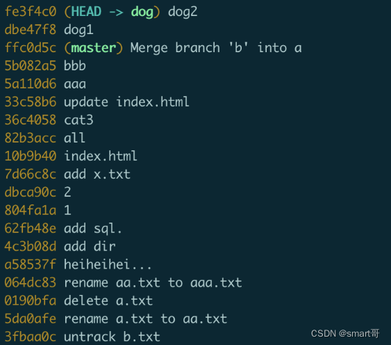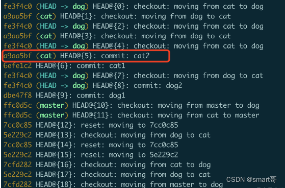 其实Reflog会记录很多好用的东西。例如,刚刚把cat分支Rebase到了dog分支上,其状态就会是这样的: