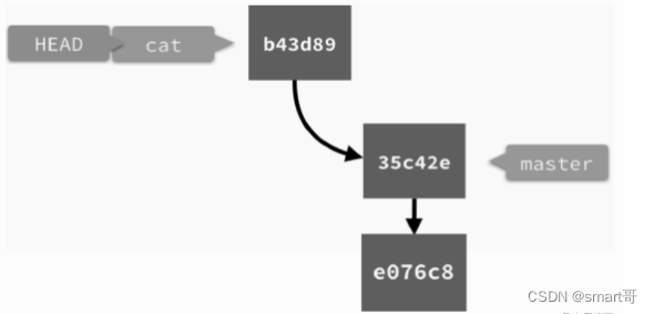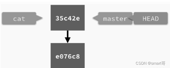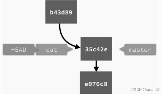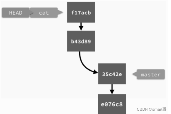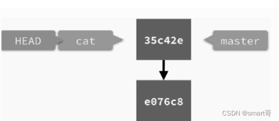 接下来执行git checkout cat命令,切换到cat分支。此时,HEAD转而指向cat分支,表示它是“当前的分支”: